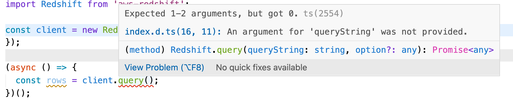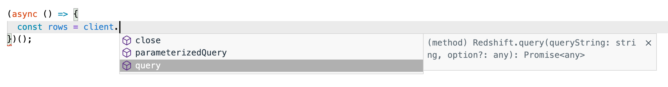 client 라는 Redshift 객체를 생성해서 어떤 메서드가 제공되는지도 IDE 의 도움을 받을 수 있습니다. 이 또한 별도로 작성한 타입 정의 덕분입니다. 옆의 메서드 설명에서도 index.d.ts 에 추가한 것 처럼 queryString 과 option 두 인자를 받아 Promise<any> 를 반환한다고 알려주고 있습니다.