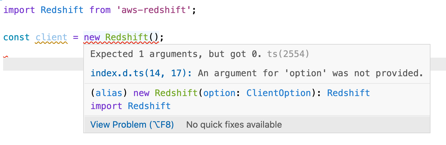 기존 타입 정의에 declare module 'aws-redshift' 한줄만 넣었을 때와 달리 객체를 생성하려고 할 경우, 생성하기 위한 'option' 이라는 인자가 들어오지 않았다고 IDE 에서 알려줍니다. 위의 타입 정의에서 constructor(option: ClientOption) 이 들어가있기 때문입니다.