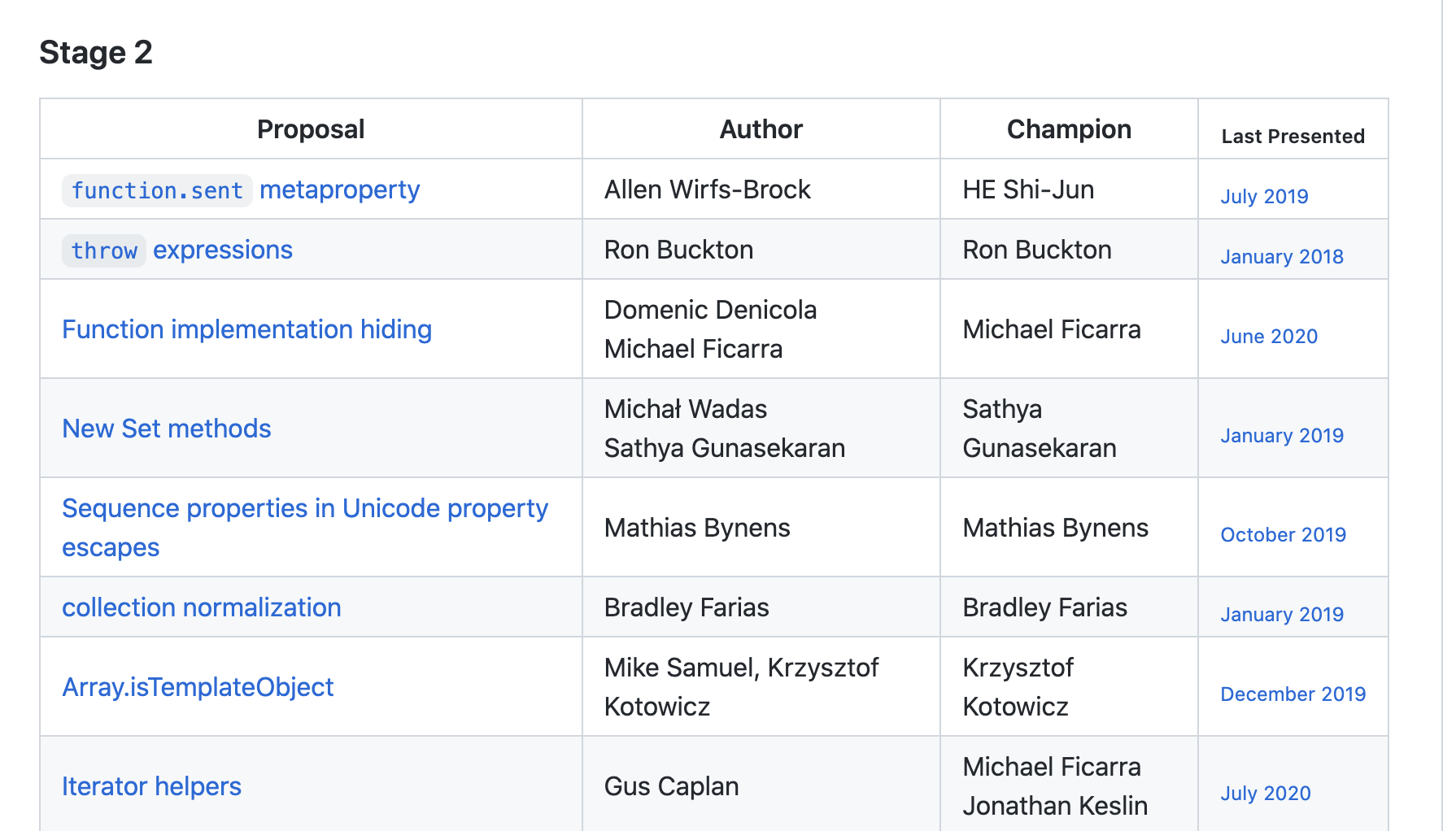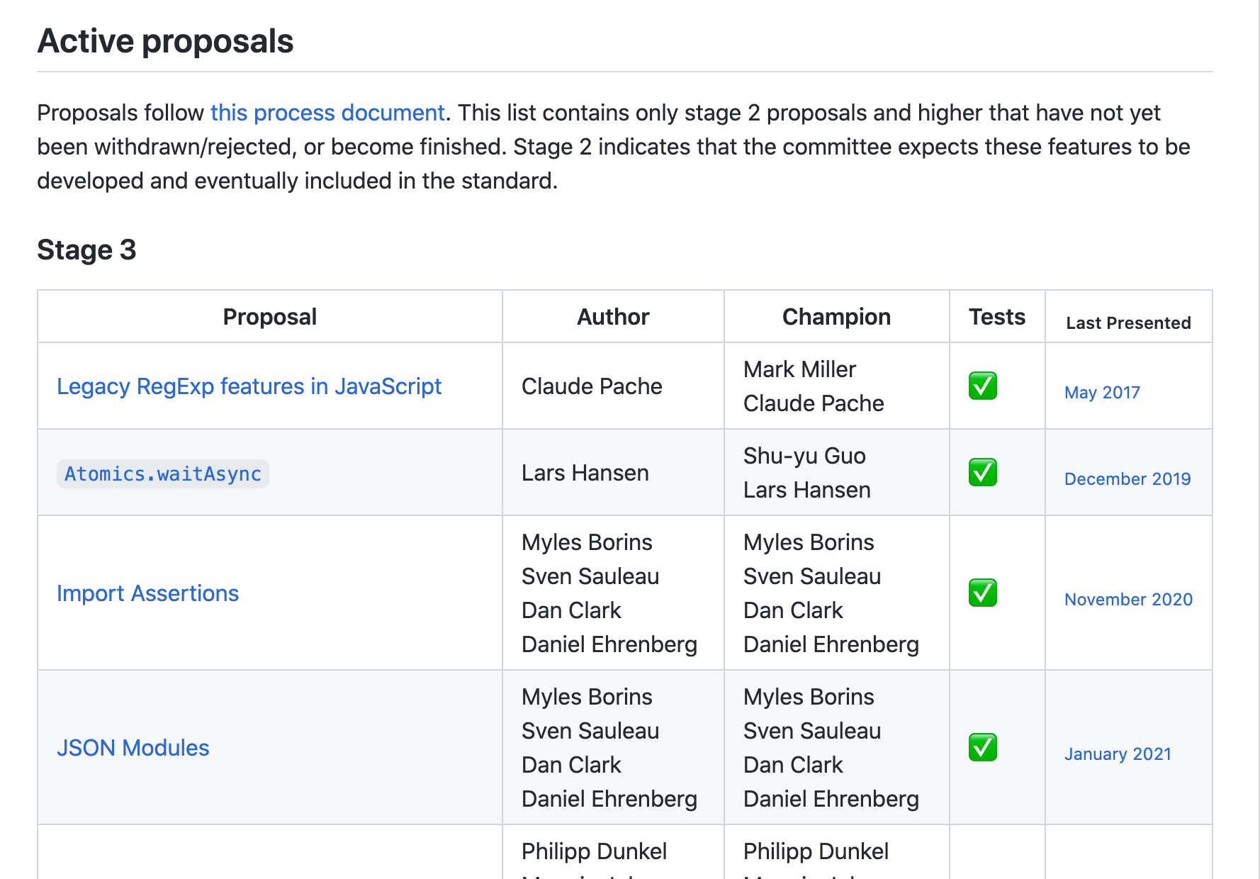 이 스테이지에 있는 제안은 TC39 멤버 중 한명이 책임을 갖고 진행하는 소유자로 정해지며 이 인원을 챔피언 이라고 한다네요.