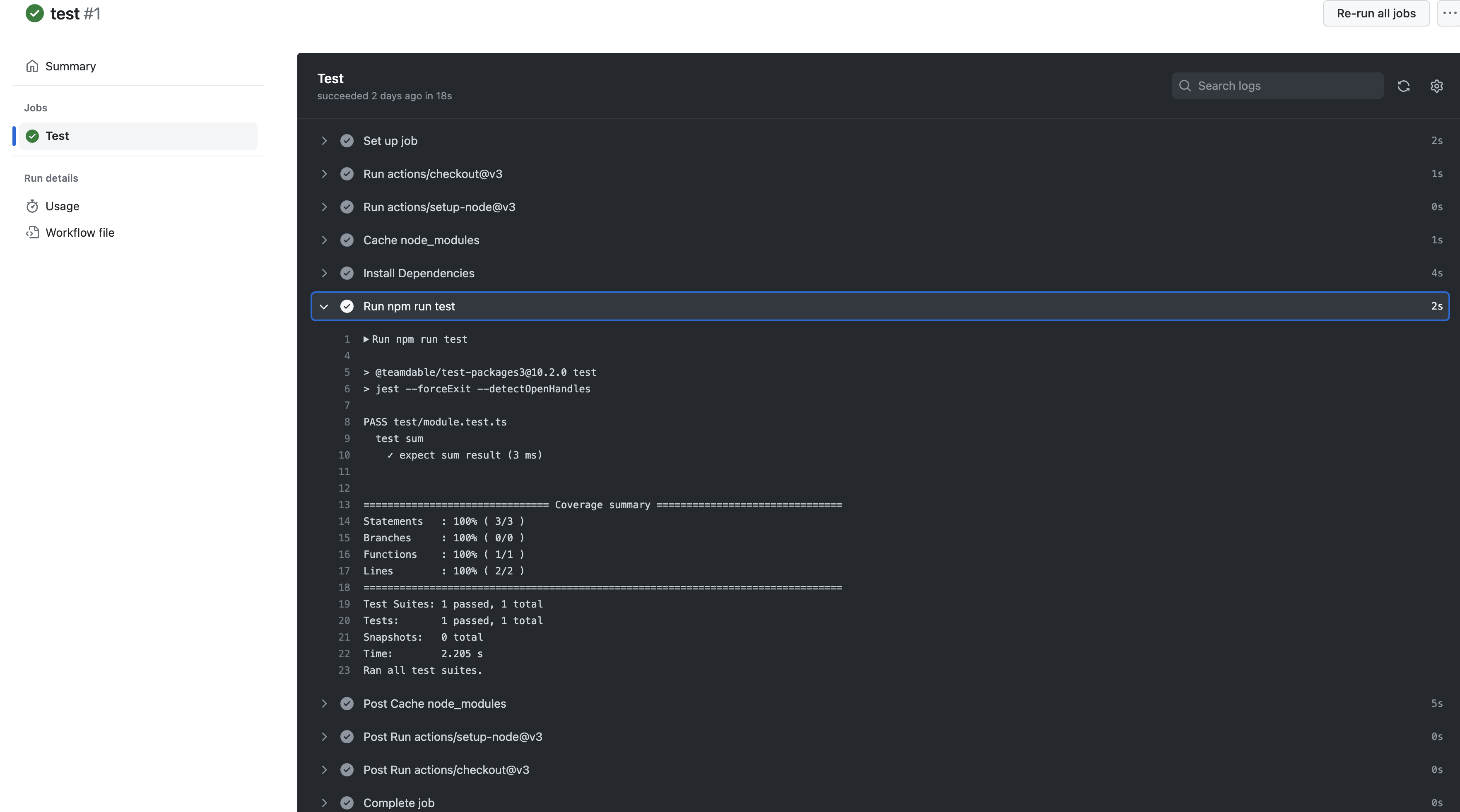 마지막엔 npm run test 를 수행해 테스트코드를 돌리고 있습니다.