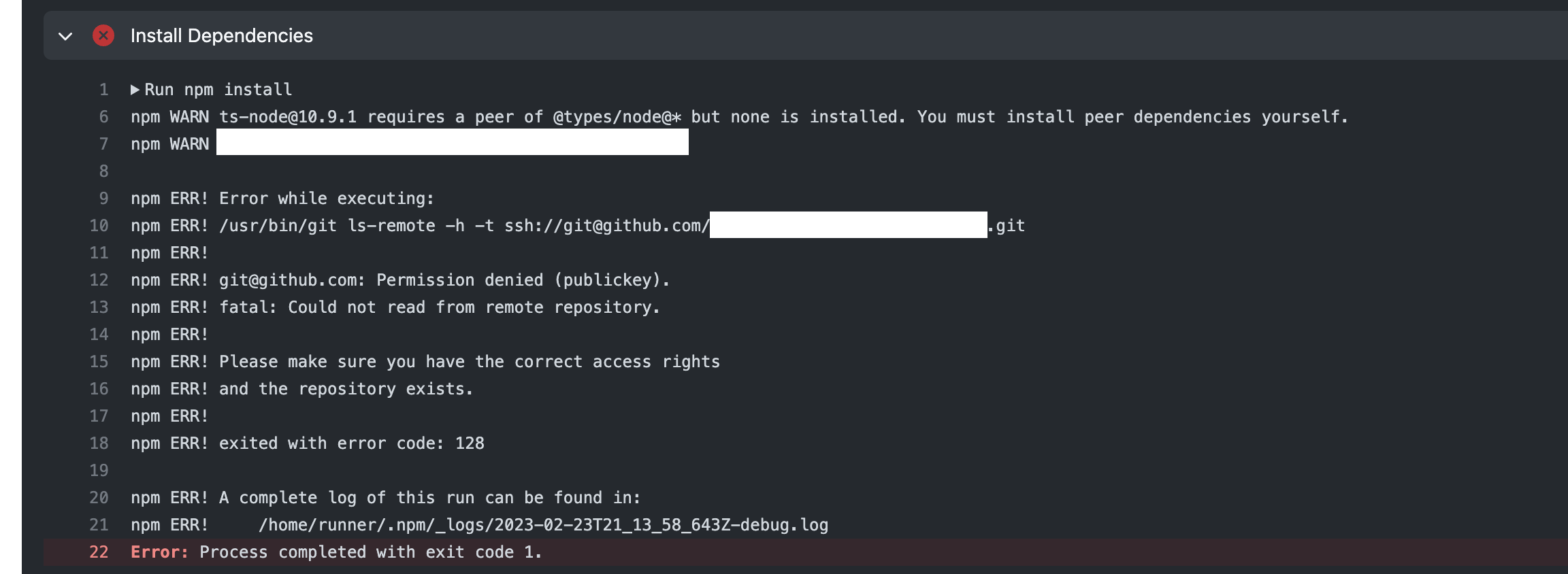 별 이상이 없겠거니 하고 workflows 의 yml 에는 다른 설정 없이 npm install 을 할 때 아래와 같은 에러로 실패하게되는데요.
