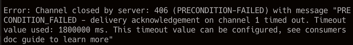 이렇게 작성하고 서버, 클라이언트 코드를 순차적으로 실행해주면 클라이언트에서 publish 를 한 메세지를 서버에서 consume 해서 메시지가 찍히는 것을 확인할 수 있습니다. 다만 이렇게만 작성하면 서버에서 아래와 같은 에러가 발생합니다.