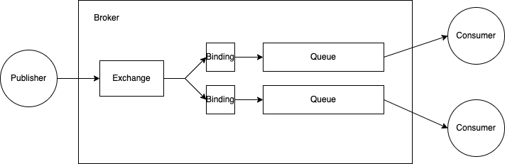 AMQP 를 사용할 때 메시지를 최종 목적지에 직접 전달하는 것이 아니라 메시지 브로커에 전달합니다. 메시지 브로커가 Exchange, Binding, Queue 에 정의된 규칙에 따라 메시지를 최종 목적지까지 라우팅해주죠.