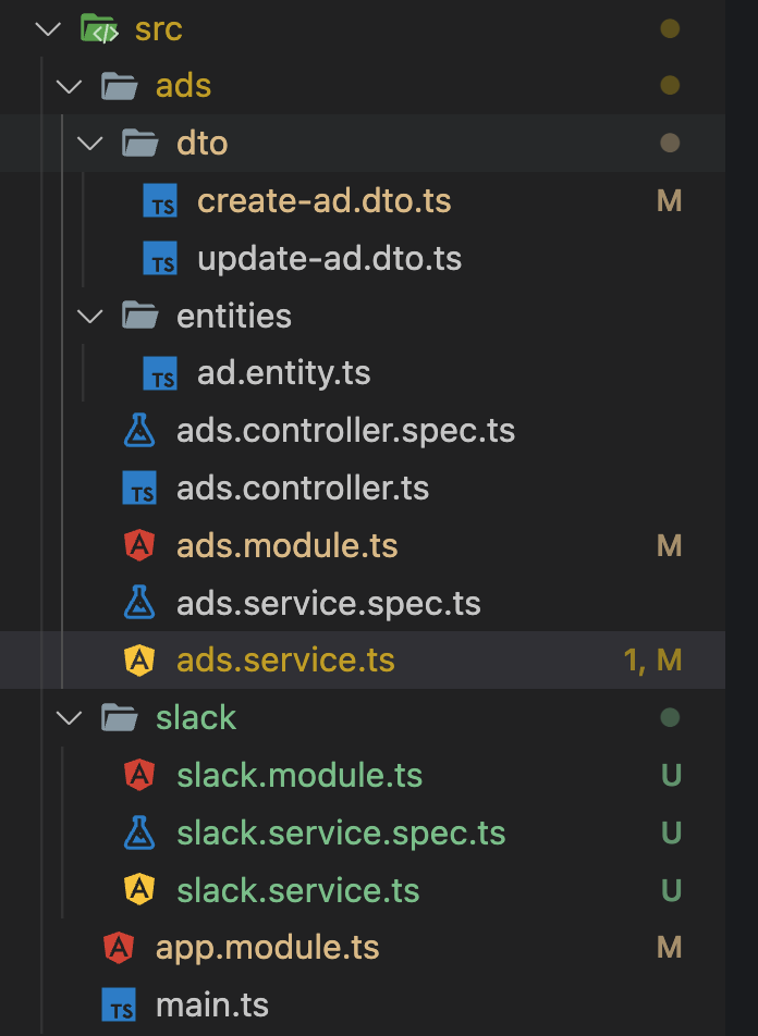 지금 작성하고 있는 서버도 app.module.ts 라는 루트 모듈을 ads.module.ts 와 slack.module.ts 가 구성하고 있죠.