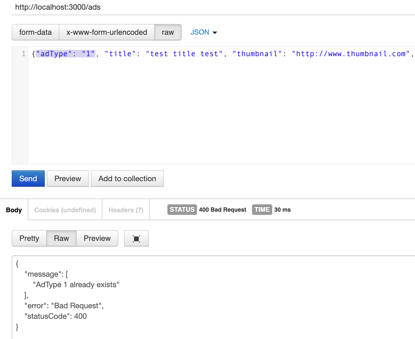 CreateAdDto 의 adType 프로퍼티에 위와 같이 데코레이터를 추가했습니다. 이번에 보면서 알게된건데 템플릿 리터럴을 쓰듯이 저렇게 표현하는 것도 상당히 편했습니다. 이제 adType 에 '1' 을 넣고 요청을 보내보겠습니다.