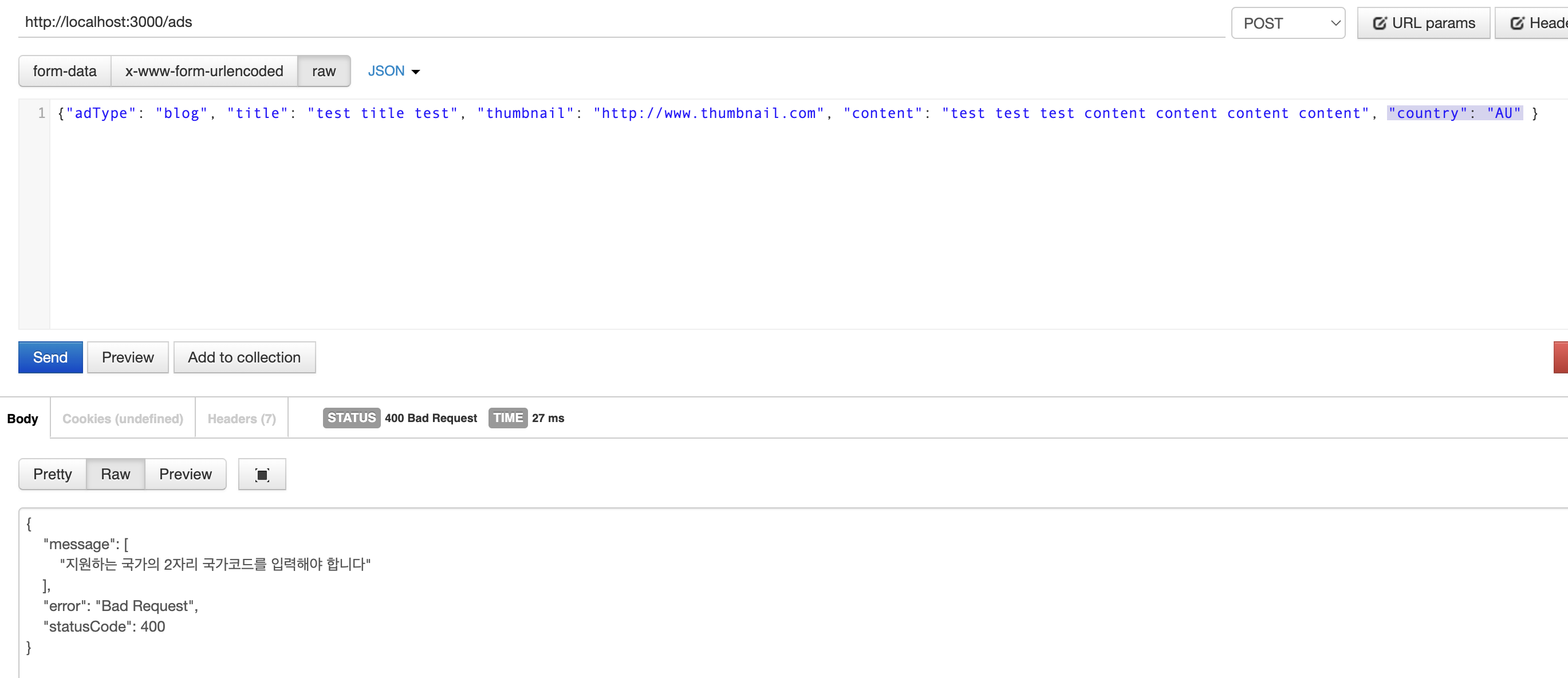 실패하면서 message 도 제가 넣었던 내용으로 뜨는 것을 볼 수 있습니다. KR 또는 US 로 넣으면 정상적으로 처리되는 것 또한 확인이