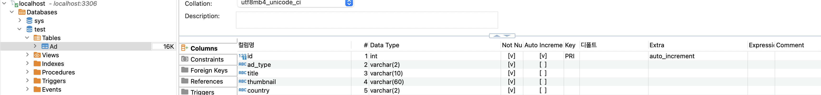 entity 코드에서 정의한대로의 컬럼을 포함한 Ad 테이블이 생성된 것을 볼 수 있습니다.
