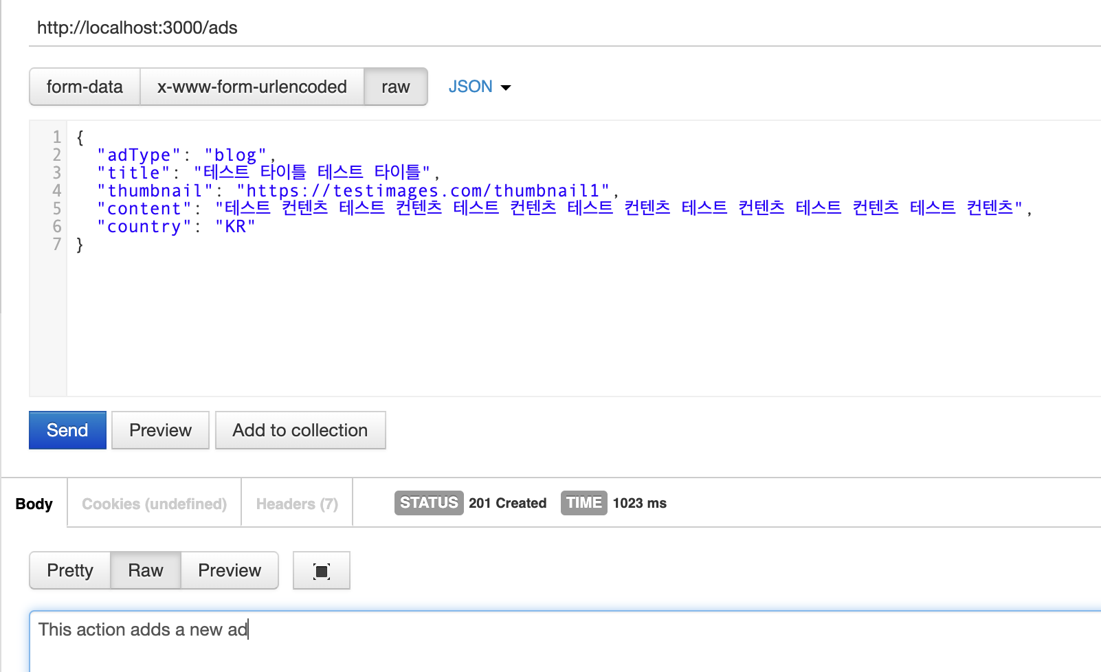 Postman 을 통해 POST API 를 호출해보면, 201 응답이 반환되는 것을 확인할 수 있습니다.