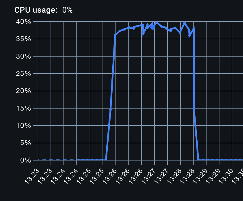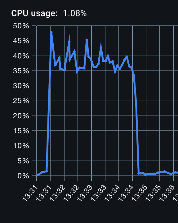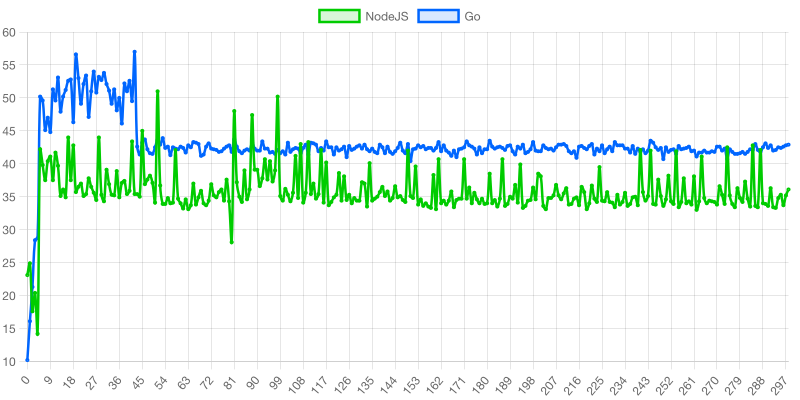 CPU 사용량입니다. 사실 저는 Go 가 직관적으로 더 좋은 성능을 보일거라고 생각했기에, 굉장히 ??? 가 드는 결과였습니다. 여러번 테스트했지만 매번 이와 비슷한 수치가 나왔습니다.