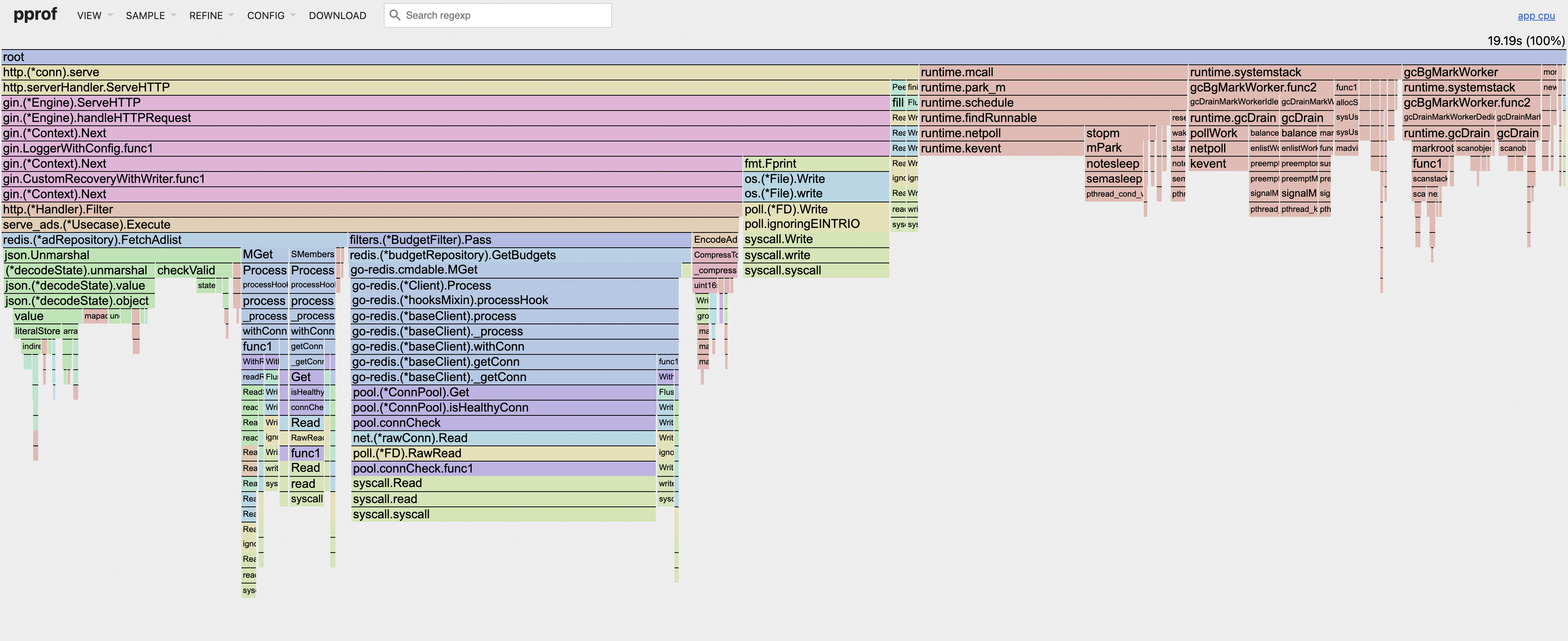 1. 저는 광고 후보군을 레디스에 넣어둘 때 기존 운영 레벨에서도 사용하던 것처럼 단순 string 으로 말아넣어두었고, 이를 MGet 으로 조회하는 전략을 취했습니다. 이러한 영향때문인지, 프로파일링 결과를 보면 FetchAdlist 하위에 json.Unmarshal, json.(*decodeState)... 와 같이 Go 에서 기본으로 제공하는 "encoding/json" 에서 크게 잡혀있는걸 확인할 수 있었습니다.