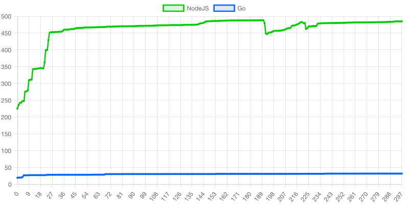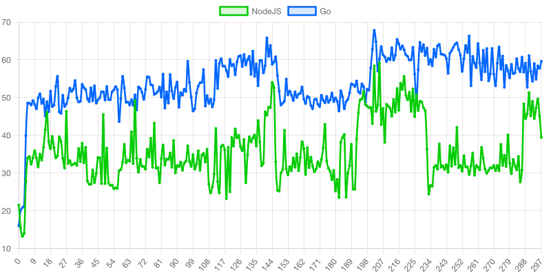 Node.js CPU / Go CPU 사용량입니다. 워크로드에 의한 v8 GC 동작때문인지 Node.js 의 CPU 는 이따금씩 튀는 모양새가 있긴한데 눈대중으로 보면 거진 비슷하지 않나 싶긴하네요.