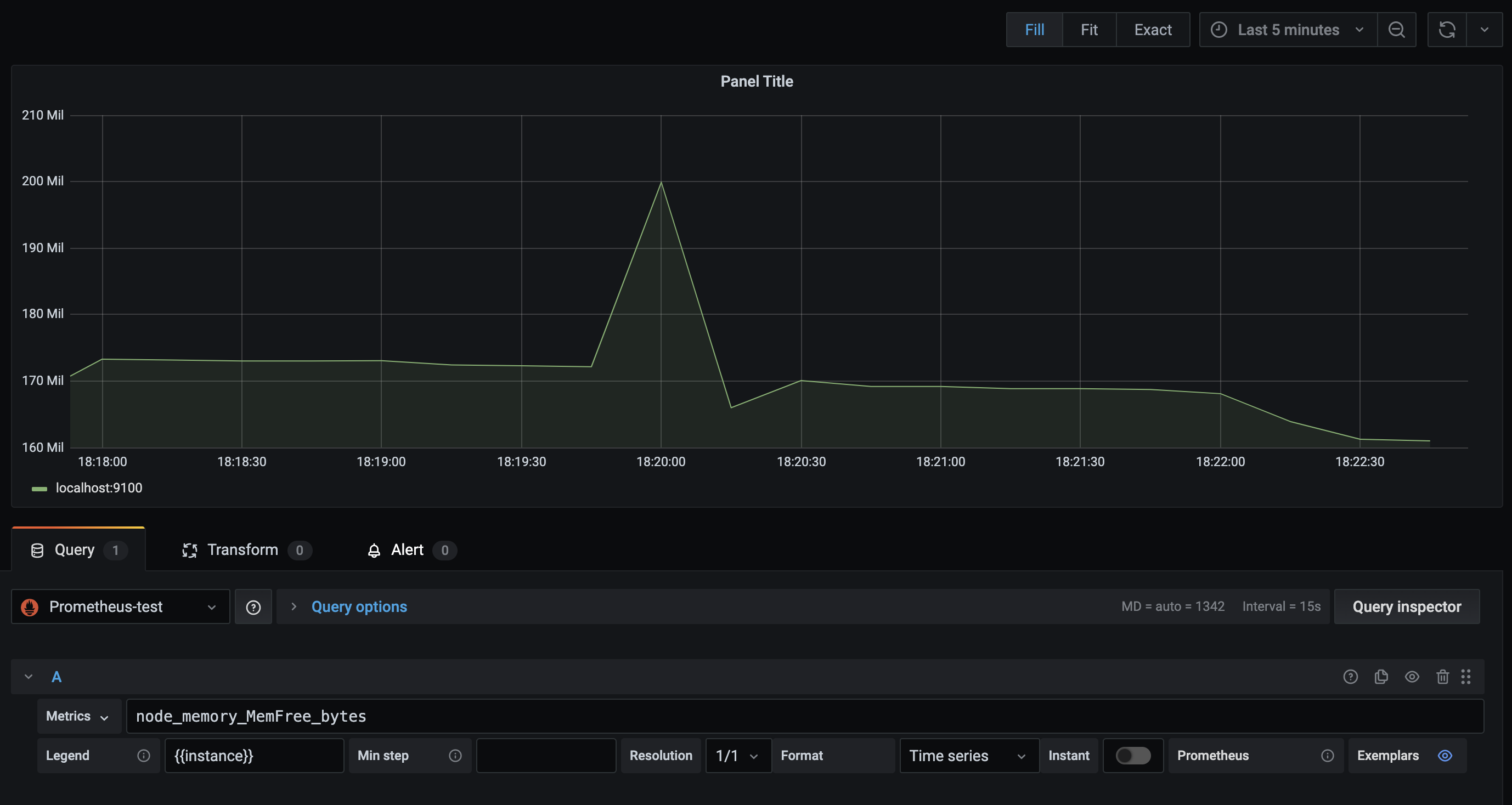 아까 prometheus UI 에서 봤던 node_memory_MemFree_bytes 메트릭을 grafana 대시보드로 시각화한 모습입니다.