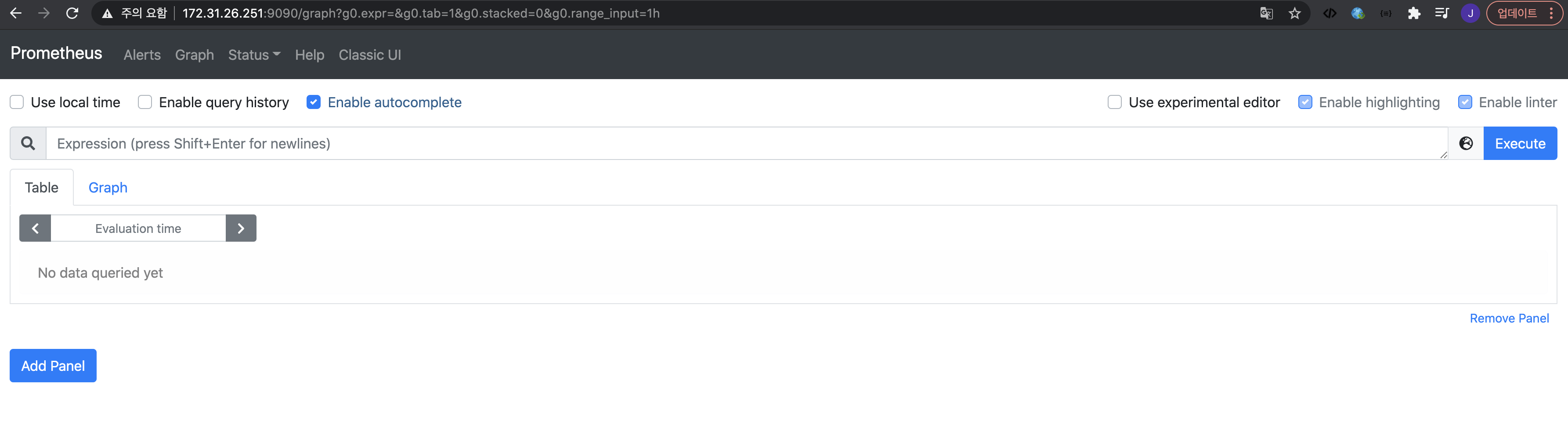 현재는 메트릭을 수집하는 target 이 없기 때문에 어떠한 메트릭도 조회가 되진 않고 prometheus 가 제대로 실행된 것만 확인 가능합니다.