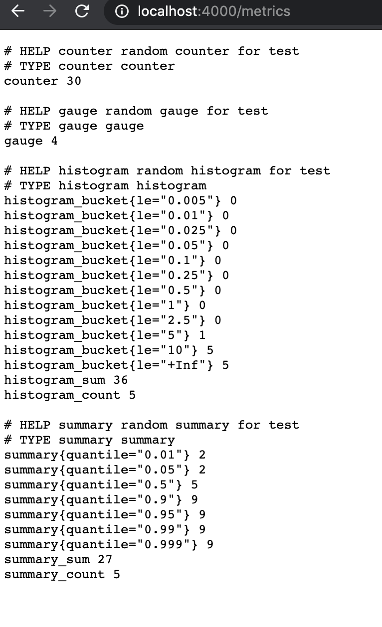 브라우저에서 localhost:4000 을 호출한 결과입니다. 이 글에서 설명했던 것과 같은 포맷의 메트릭을 확인할 수 있습니다.