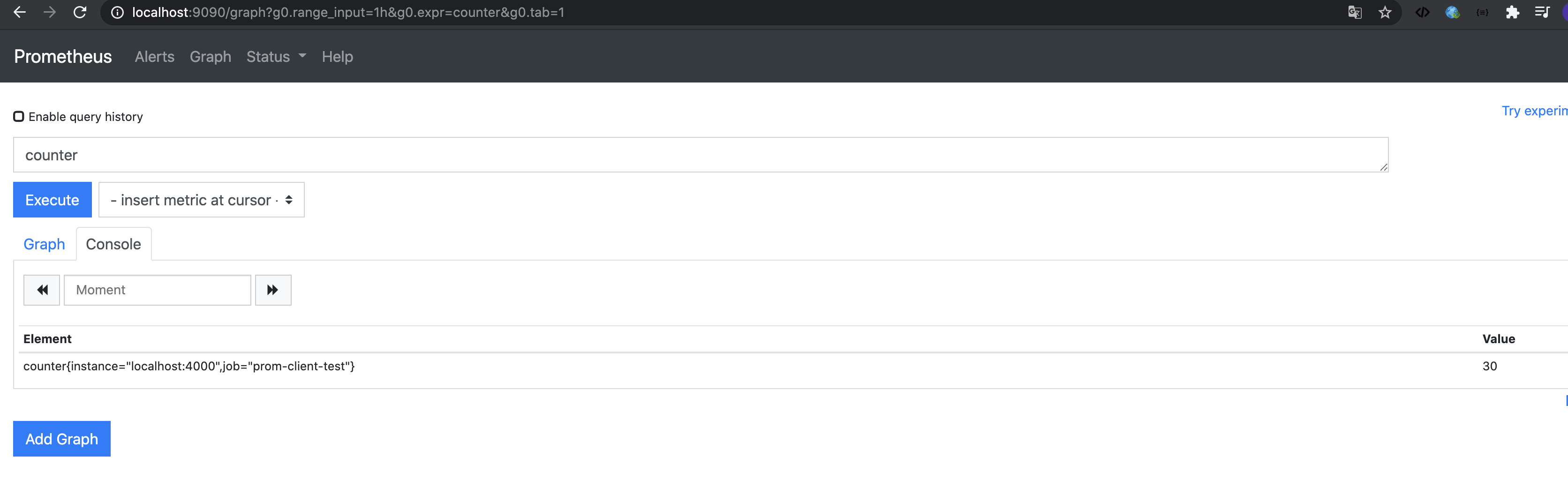 호출한 결과대로 메트릭이 수집되었다면 counter 는 받은 값들을 inc 하므로 30 이 되어야하고,