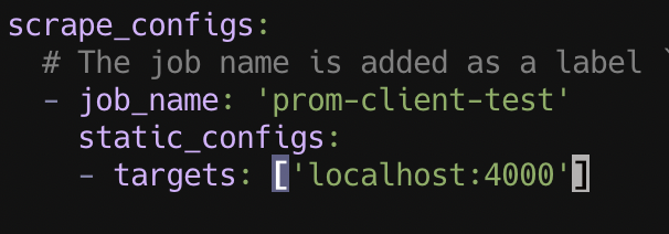 localhost:4000/metrics 로 메트릭 조회가 가능하도록 했으니, 이제 Prometheus 설정에서 타겟을 여기로 바꾸기만 하면 됩니다.