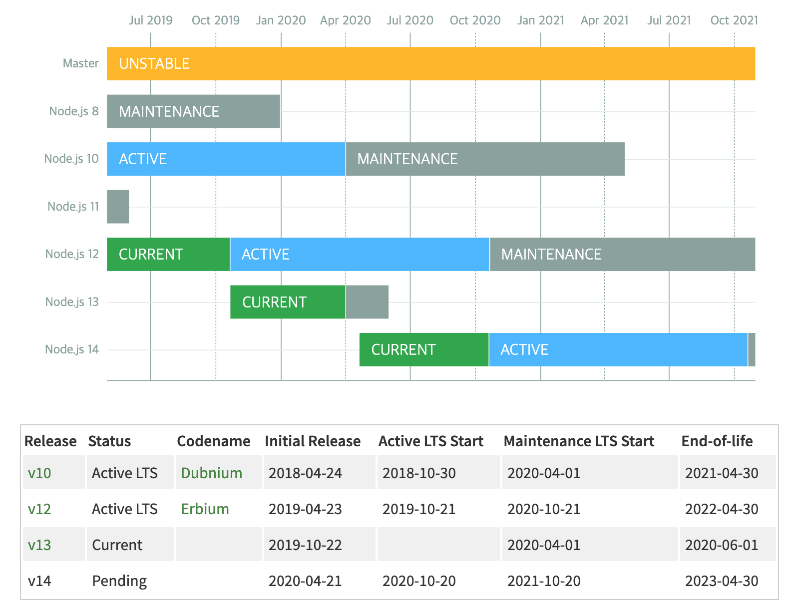 - 위 그림에서처럼 v12 의 경우 짝수 버전이기 때문에 Current -> Active LTS -> Maintenence LTS -> EOL 의 순서대로 진행됩니다.