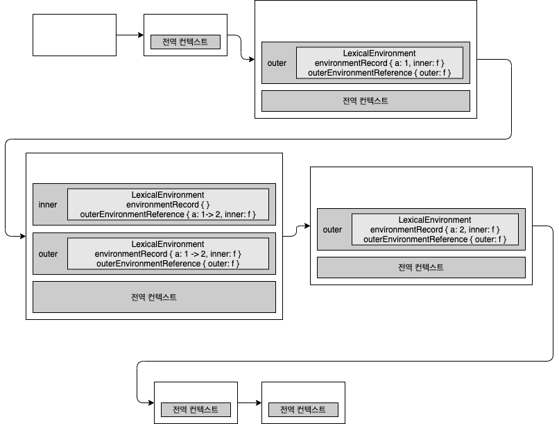 inner 함수는 outer 함수 내부에서 선언됐으므로 스코프 체이닝에 따라 outer 에서 선언한 a 에 접근해 1을 증가시킨 값을 반환하고, inner 함수의 실행 컨텍스트가 종료되는 형태로 되어 있습니다.