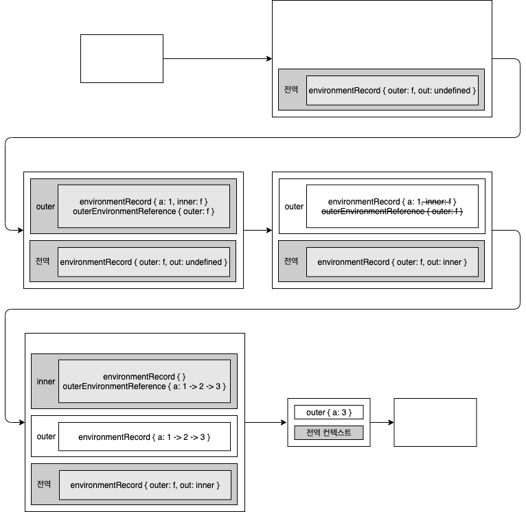 outer 함수는 실행 종료 시점에 inner 함수를 반환합니다. outer 실행이 종료되어도 inner 함수가 out 을 언젠가 실행할 수 있게 됨으로써, inner 함수의 실행 컨텍스트가 활성화되면 outerEnvironmentReference 가 outer 함수의 LexicalEnvironment 를 참조해야 하기 때문에 수집 대상에서 제외됩니다. 이 때문에 inner 함수가 outer 의 변수에 접근할 수 있는 것입니다.