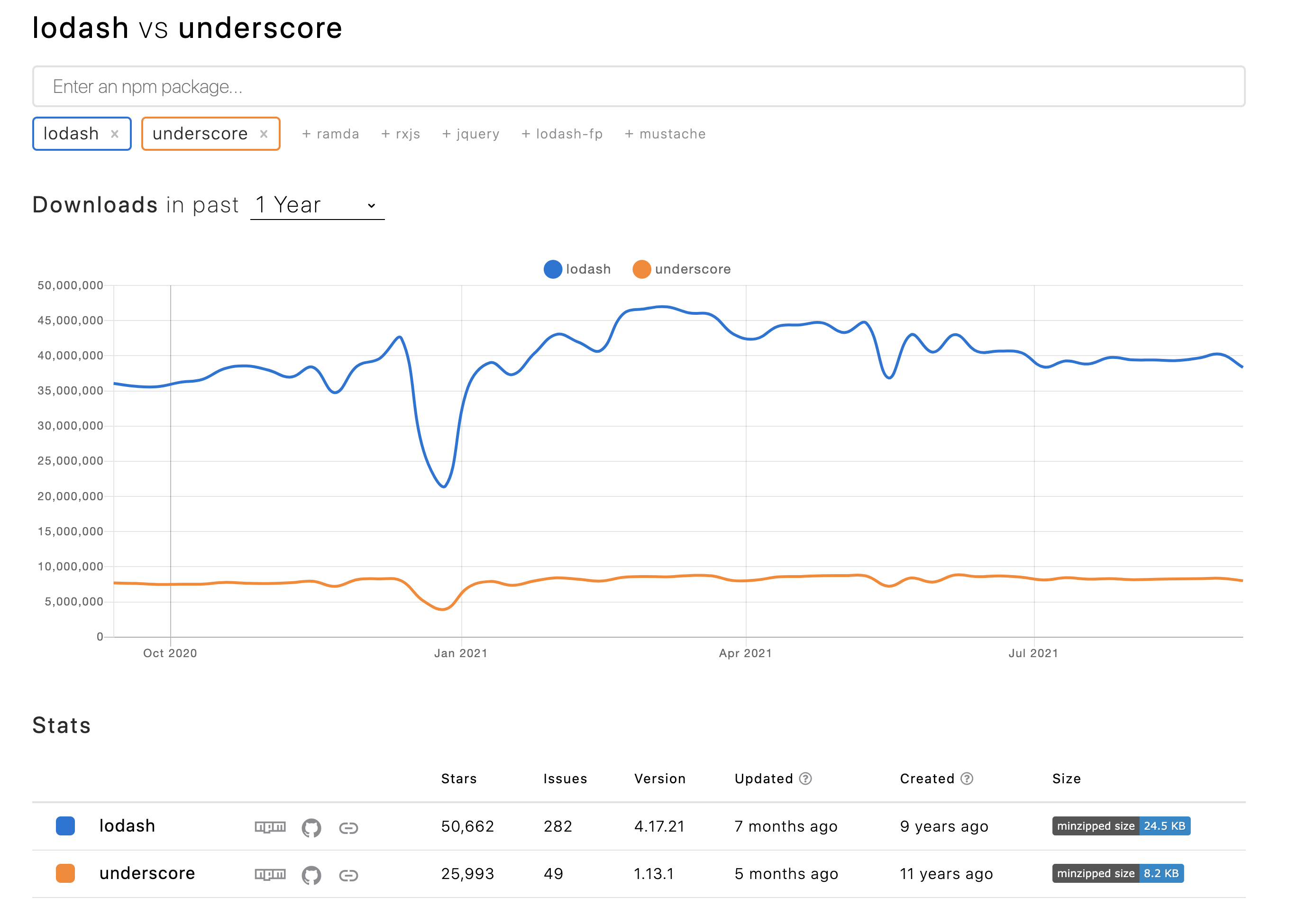 확실히 Lodash 가 버전도 많이 나왔고, 다운로드 수에서도 보이듯이 인기가 압도적입니다.